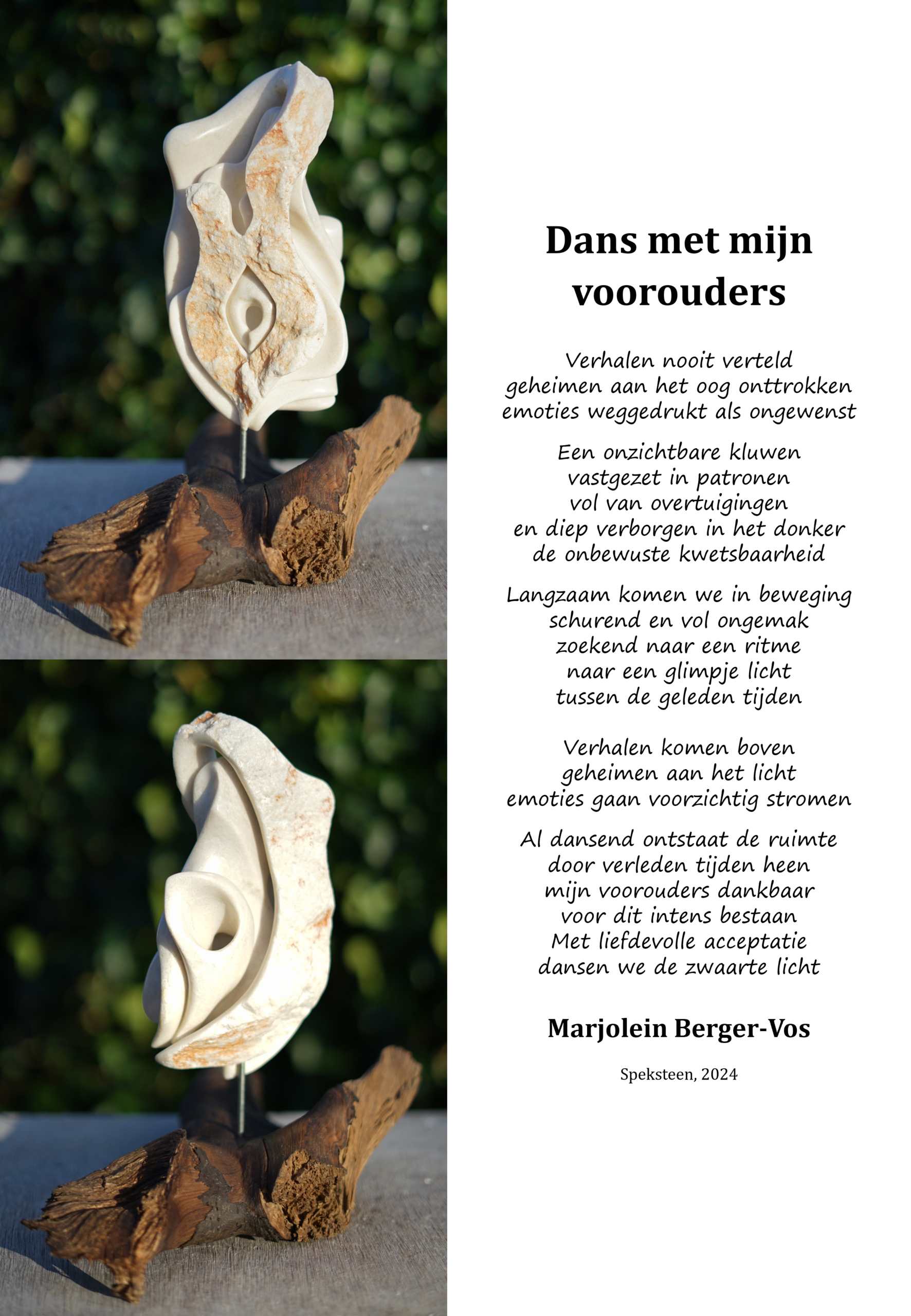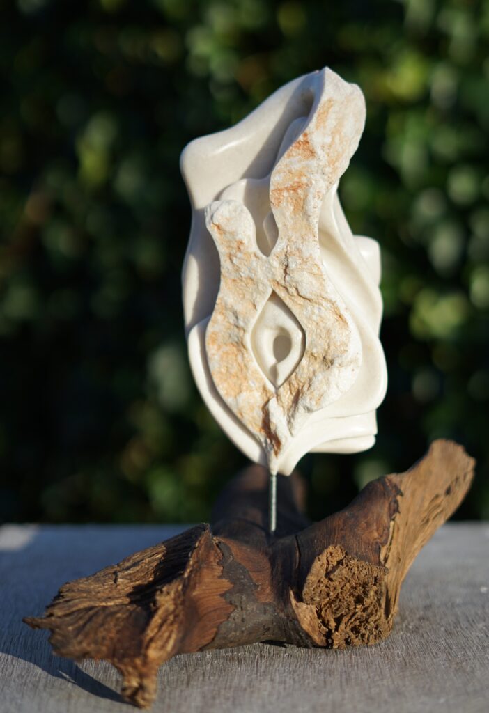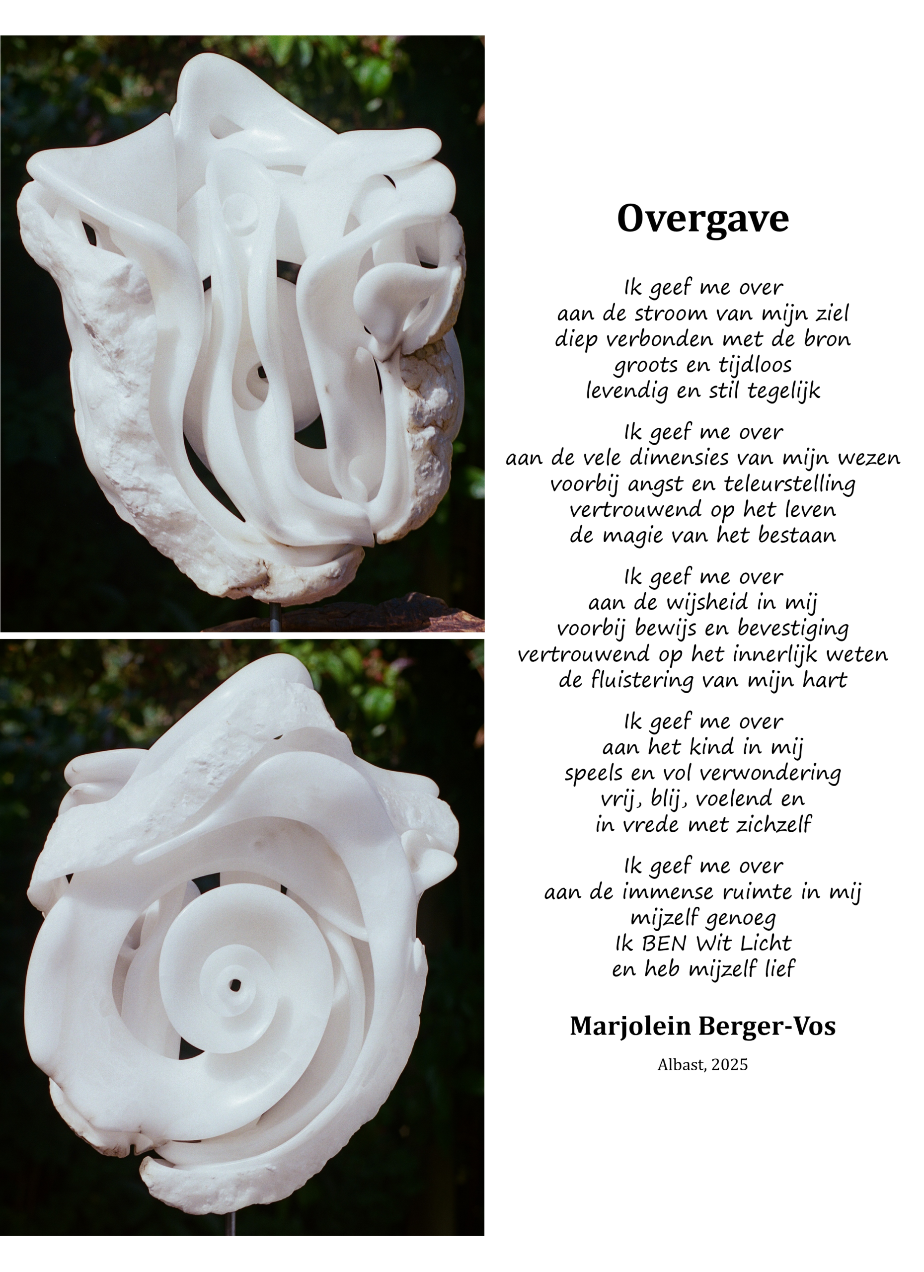 “Mijn beelden van steen worden gekenmerkt door uitgesproken, organische, opengewerkte vormen, waarbij het licht vrij spel heeft. Het proces is intuïtief, onderzoekend en zonder vooropgezet plan. Tegelijkertijd gaat het om het maken van keuzes. Wat is de beste, mooiste, krachtigste keuze die ik nu kan maken? Elk moment weer.